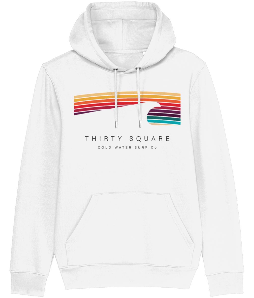 Our THIRTY-SQUARE cozy go-to organic cotton hoodie is soft, smooth, and ready for everyday adventures. With large rainbow wave print on the front. Inspired by cold water surfing on the Isle of Tiree.